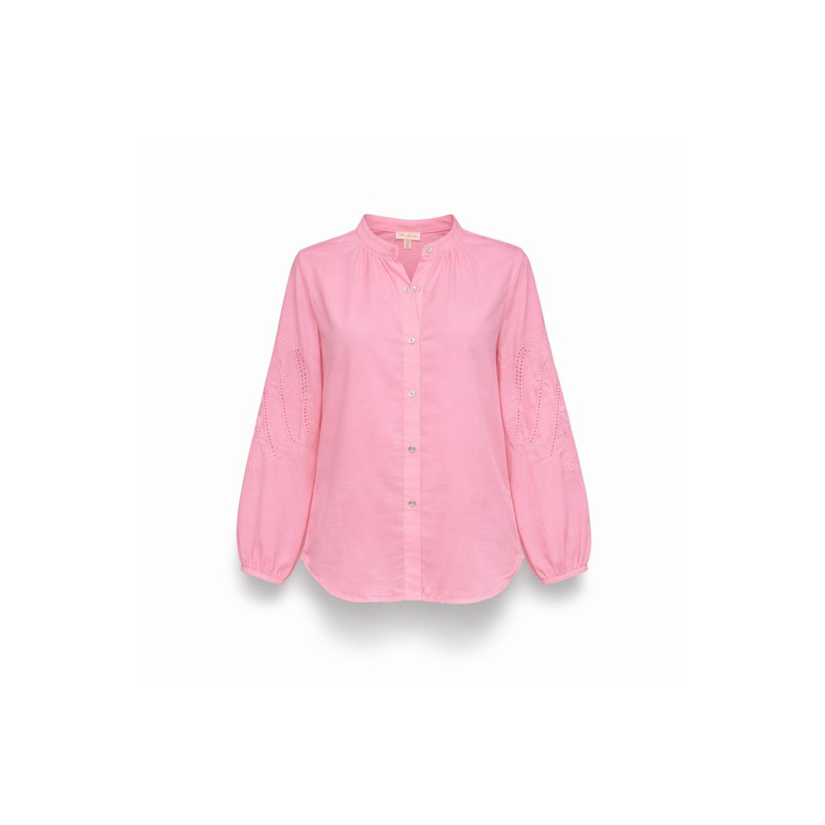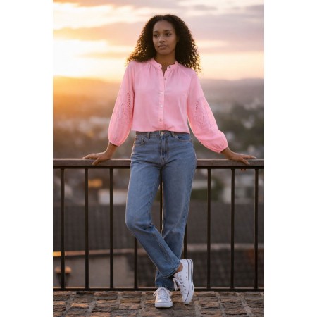 Jolie blouse bohème femme, coloris rose vif, manches longues brodées, poignets élastiqués. Petit col montant.