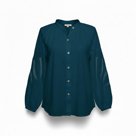 Jolie blouse bohème femme, coloris marine, manches longues brodées, poignets élastiqués. Petit col montant.