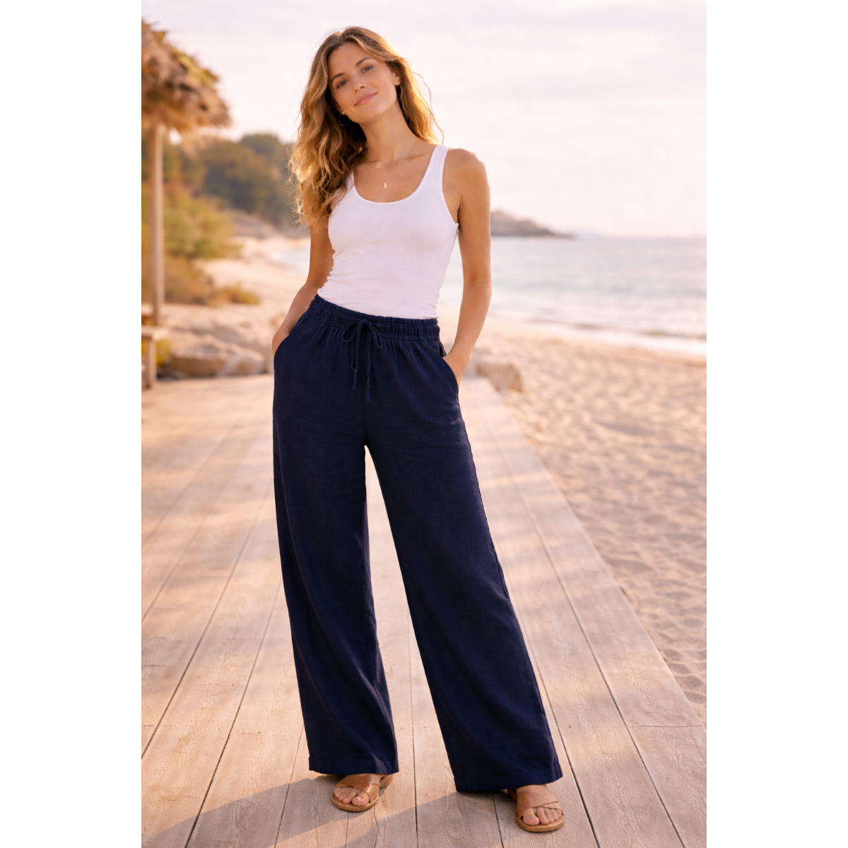 Naturellement élégant et résolument confortable, ce pantalon en 100% lin est une pièce essentielle du vestiaire estival féminin. Inspiré par l’air marin et les silhouettes libres, il accompagne chaque mouvement avec fluidité et légèreté.