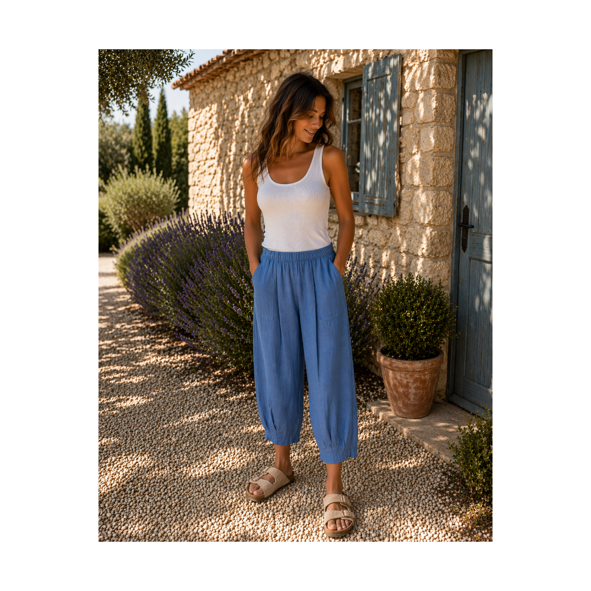 La longueur, légèrement au-dessus de la cheville, met en valeur la silhouette et permet de le porter facilement avec des sandales, baskets ou talons.