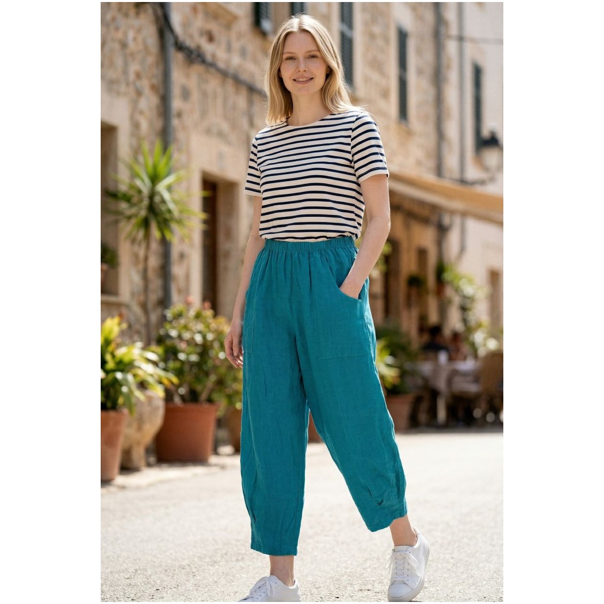 PantaCOURT large lin femme, coloris turquoise ; équilibre entre confort et éthique.