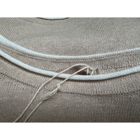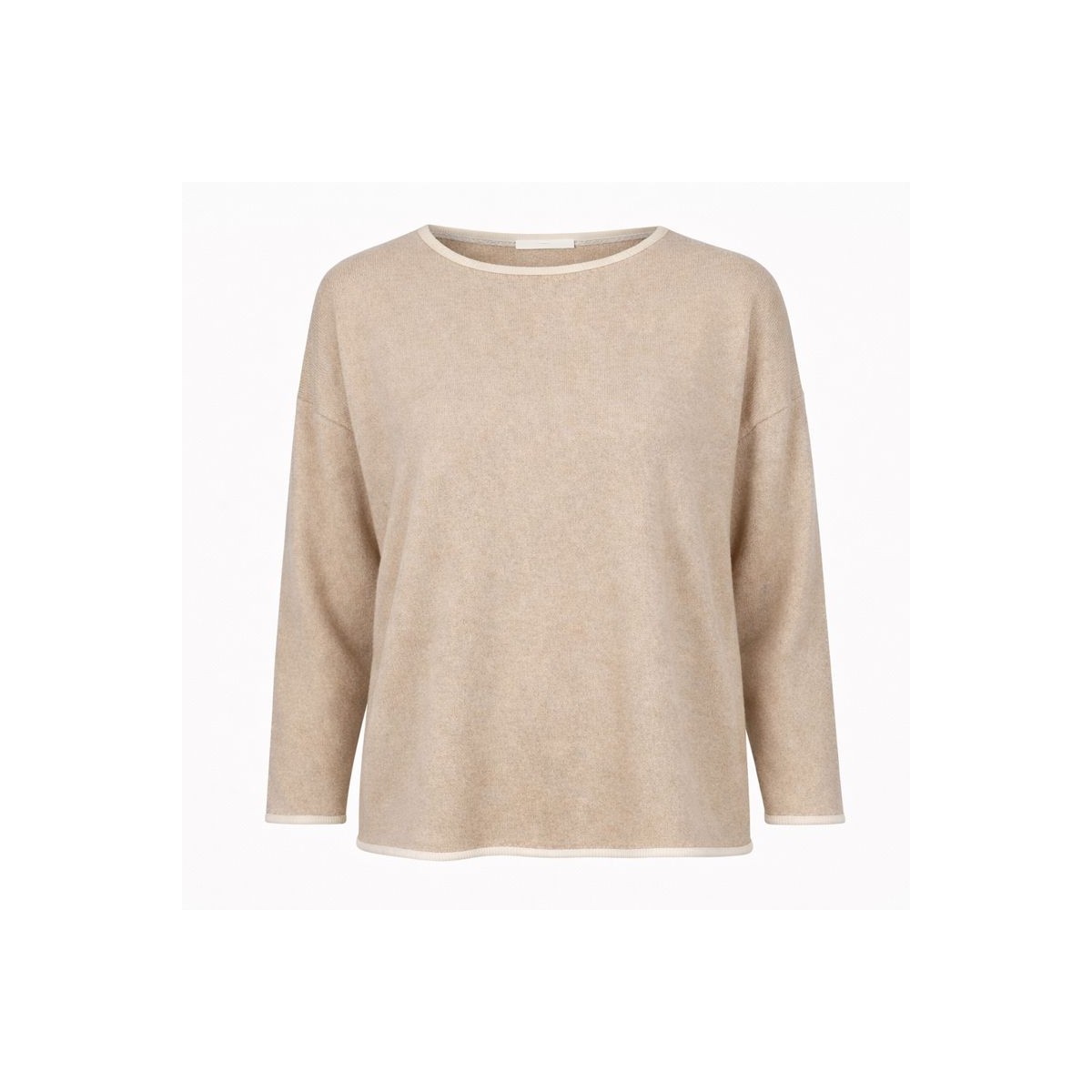 Pull femme en Coton et acrylique, coloris beige avec fin liseré rouloté écru sur col, manches et base. Coloris du pull discrètement chiné.