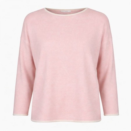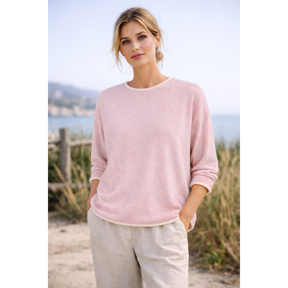 Pull femme en Coton et acrylique, coloris rose avec fin liseré rouloté écru sur col, manches et base. Coloris du pull discrètement chiné.