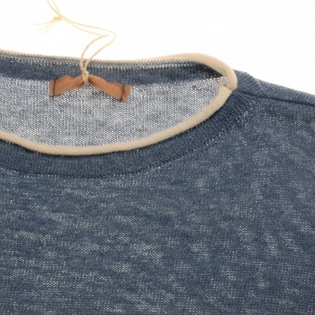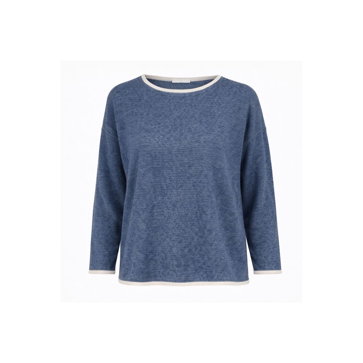 Pull femme en Coton et acrylique, coloris indigo avec fin liseré rouloté écru sur col, manches et base. Coloris du pull discrètement chiné.