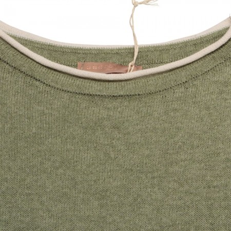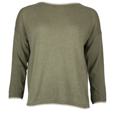 Pull femme en Coton et acrylique, coloris kaki avec fin liseré rouloté écru sur col, manches et base. Coloris du pull discrètement chiné.