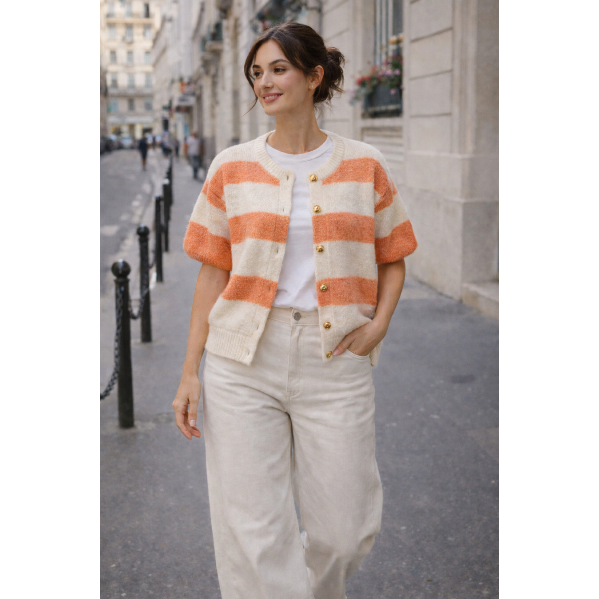 Gilet Abricot femme, coloris écru / orange ; un style doux et contemporain, très tendance.