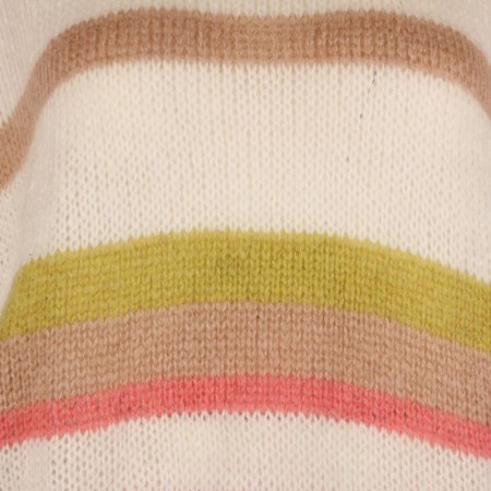 Ses épaules légèrement tombantes créent une allure naturelle et moderne, tandis que les rayures pastel – mauve, beige, anis et rose – illuminent le modèle avec subtilité. Le col rond et les bord-côtes écrus structurent l’ensemble et apportent une finition élégante et lumineuse.