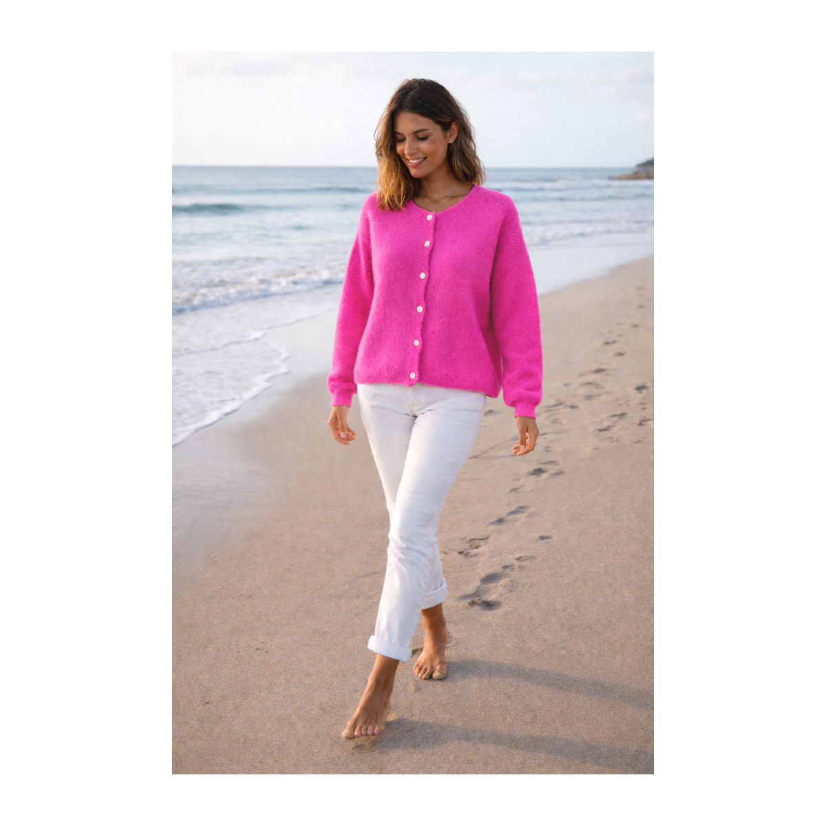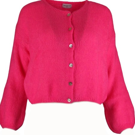 Gilet manches longues, coloris rose fluo ; une vraie caresse sur la peau.