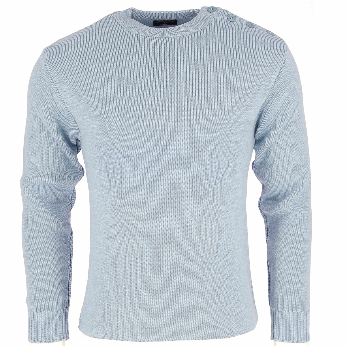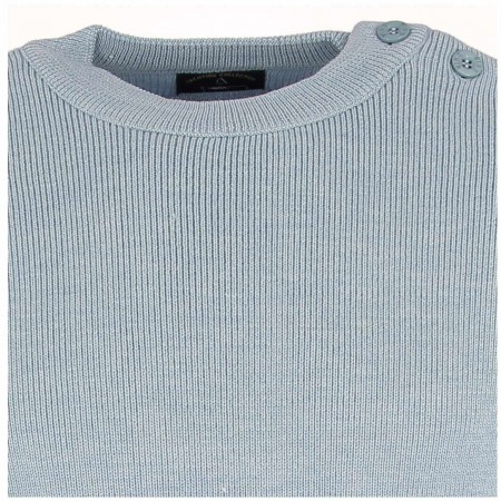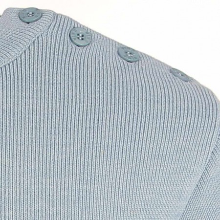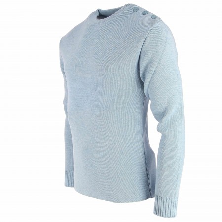 Pull marin homme en laine Mérinos, coloris bleu ciel. Un col rond, patte de boutonnage sur l'épaule gauche. Finitions bords côtes.