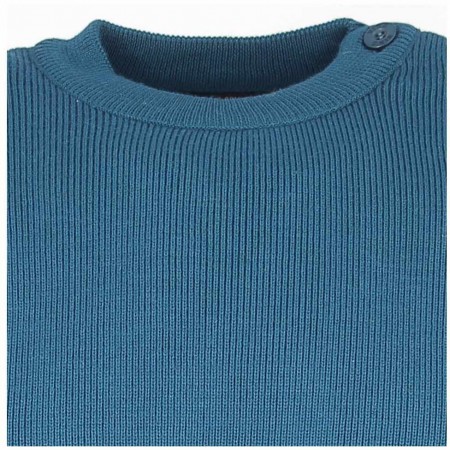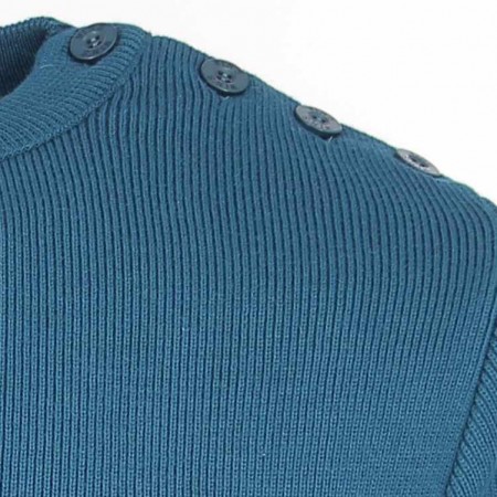 Pull marin homme en laine Mérinos, coloris bleu Paon. Un col rond, patte de boutonnage sur l'épaule gauche. Finitions bords côtes.