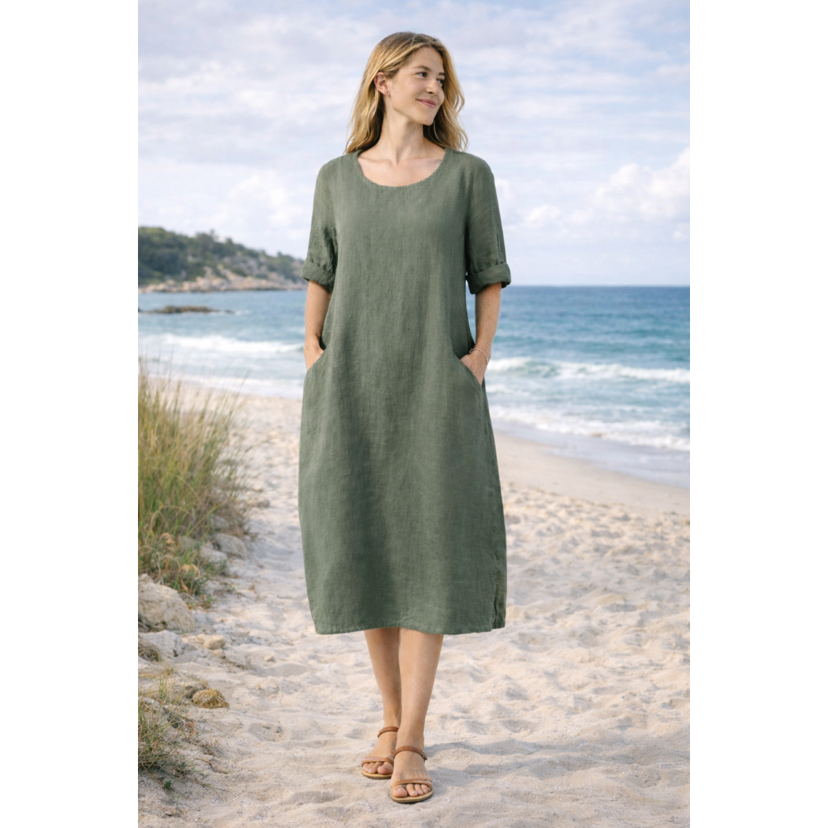 Robe lin femme, coloris kaki ; équilibre entre confort et éthique.